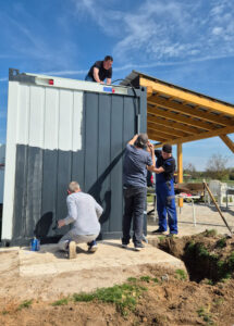 Die Farbbezeichnung lautet Anthrazit, wir haben es eher als Dunkelgrau identifiziert, macht aber nichts: sieht trotzdem gut aus. Was die Farbroller nicht abdecken konnten, erledigte der Nächste mit dem Pinsel, sodass der Container am Nachmittag durch den fleißigen Malereinsatz komplett fertig gestrichen in edlem Dunkelgrau erstrahlte.