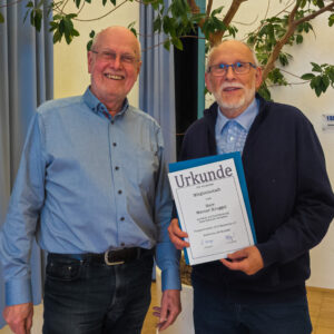 Werner Kruggel (rechts) wird für 40 Jahre Mitgliedschaft durch den ersten Vorsitzenden Roland Helfer (links) geehrt.